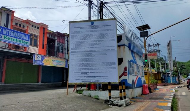 Baliho penjaringan masukan masyarakat dalam konsultasi publik terbuka yang dipasang di perempatan traffic light Jl. Trikora Wosi. TP/SDR