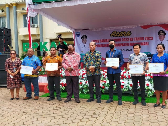 Surat Keputusan (SK) kenaikan pangkat bagi 210 pegawai tersebut telah diserahkan secara simbolis oleh Bupati Manokwari, Hermus Indou didampingi Sekda, Henri Sembiring pada syukuran lepas sambut tahun baru 2023 yang dilaksanakan di halaman kantor Bupati, Jumat (6/1/2023).