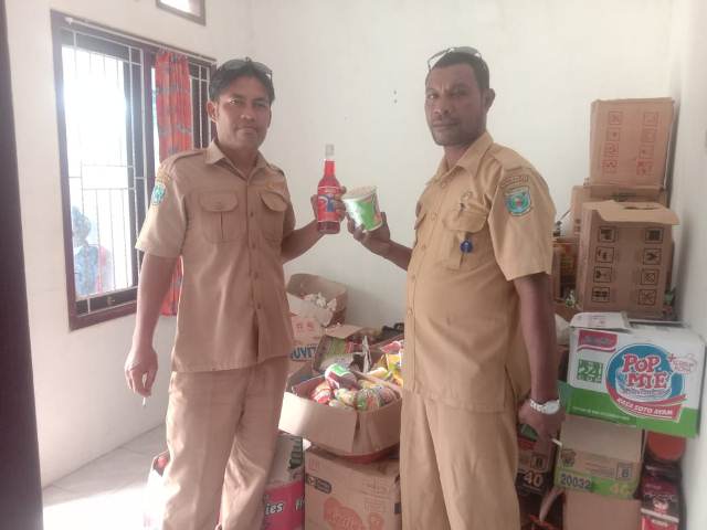 Kepala Bidang Perdagangan pada Disperindagkop dan UKM Kabupaten Mansel, Bram Lincalu Wambrauw, didampingi staf menunjukkan bahwa produk makanan dan minuman kadaluarsa, di Kantor Disperindagkop dan UKM Kabupaten Mansel, Senin (6/3). TP/BOM