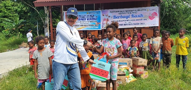 Manokwari, TABURAPOS.CO – Paguyuban bersama Persatuan Oikumene Umat Kristen Balai Prasarana Permukiman Wilayah (BPPW) Papua Barat berbagi kasih di Taman Belajar Gereja Katolik Santa Maria Medali Wasiat Kampung Meyes Distrik Manokwari Utara Kabupaten Manokwari, Sabtu (1/4/2023).