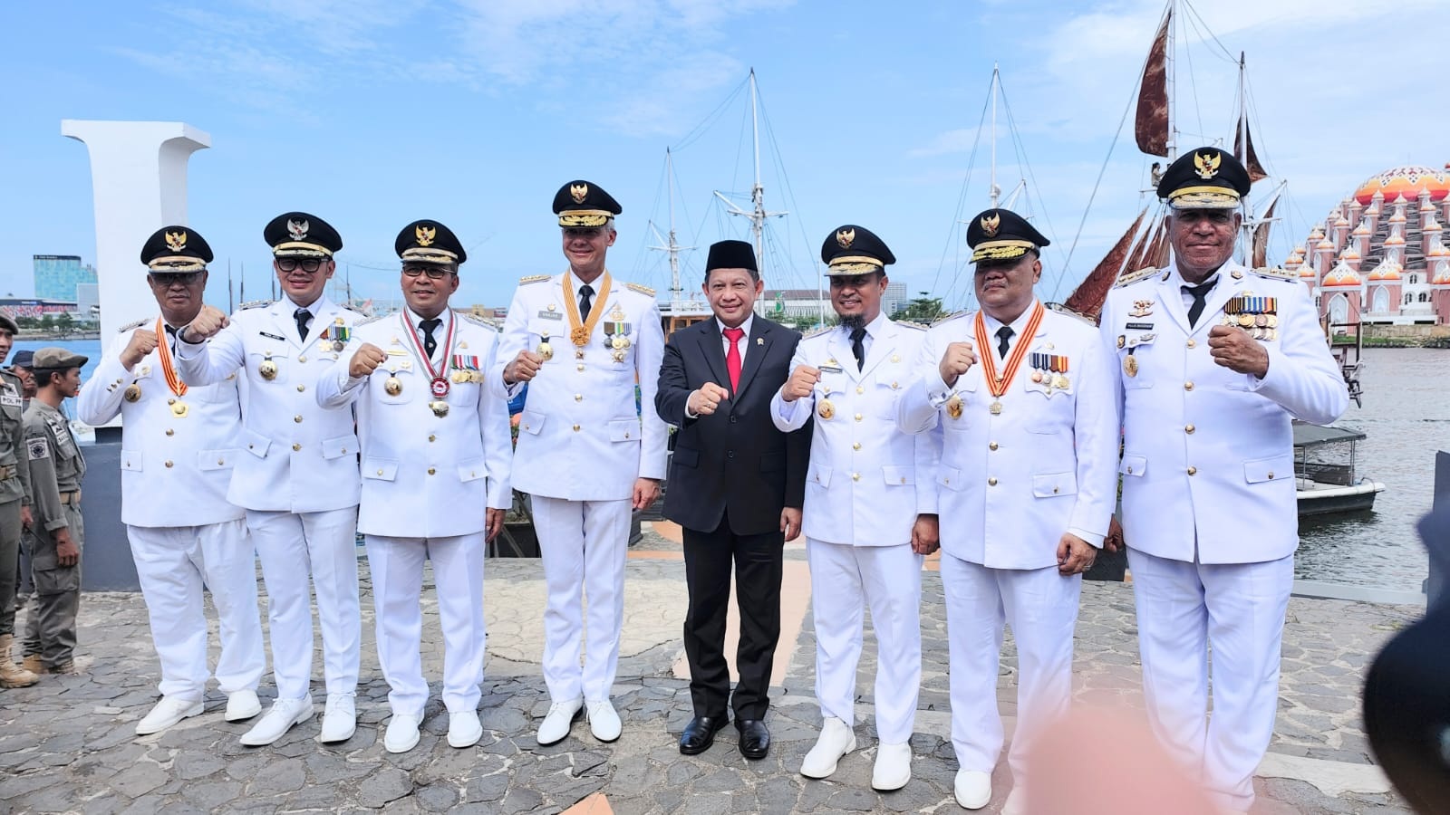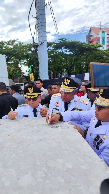 Penjabat Gubernur Papua Barat, Paulus Waterpauw bersama para Gubernur, Bupati, Walikota se Indonesia, nampak ikut menandatangani prasasti tersebut yang terletak di Pantai Losari Makasar.