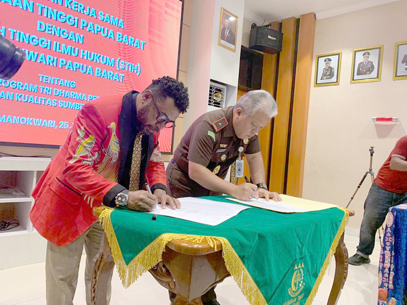Penandatanganan MoU ini dilakukan Kajati Papua Barat, Harli Siregar dan Ketua STIH Manokwari, Filep Wamafma di Aula Kejati Papua Barat, Manokwari, Selasa (25/7).
