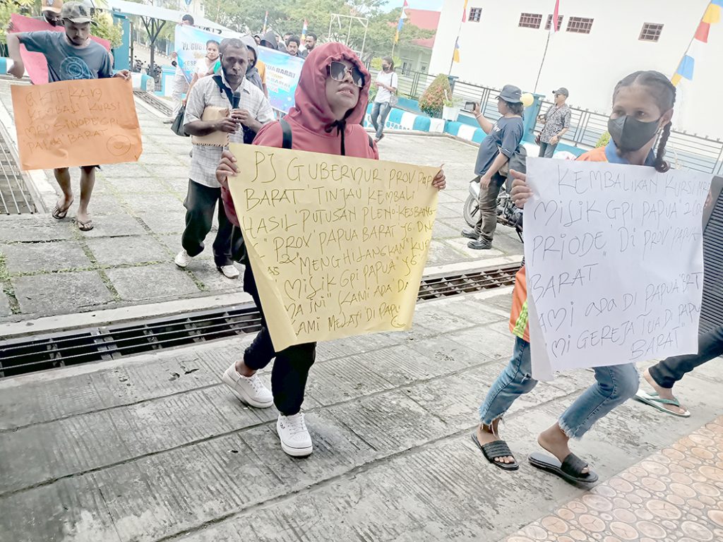 Pantauan Tabura Pos, warga GPI Papua datang dengan membawa dua buah spanduk bertulisan “Pj. Gubernur Provinsi Papua Barat Tinjau Kembali Hasil Putusan Pleno, Kesbangpol Provinsi Papua Barat kursi majelis Rakyat Papua milik Sinode GPI Papua yang telah ada selama ini,”