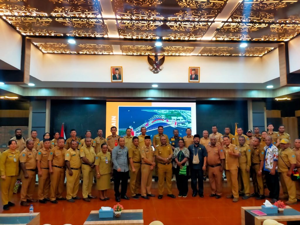 Bupati Manokwari Hermus Indou bersama pimpinan OPD di lingkup Pemkab Manokwari, saat pertemuan penyampaian empat program pembangunan infrastruktur strategis, di Sasana Karya Kantor Bupati, Senin (11/9). TP/SDR