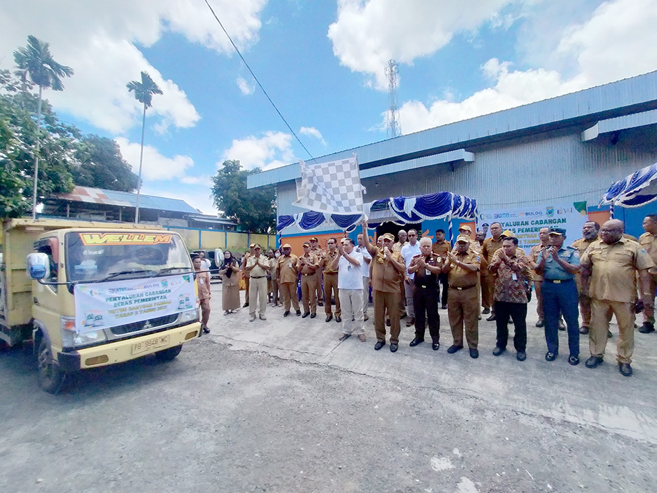 Pelepasan truk muatan beras bantuan untuk disalurkan kepada masyarakat oleh Pj Gubernur Papua Barat, Paulus Waterpauw, Bupati Manokwari, Kepala Bulog Subdivre Manokwari, Kurniawan, di Gudang Bulog Manokwari, Selasa (12/9). TP/SDR