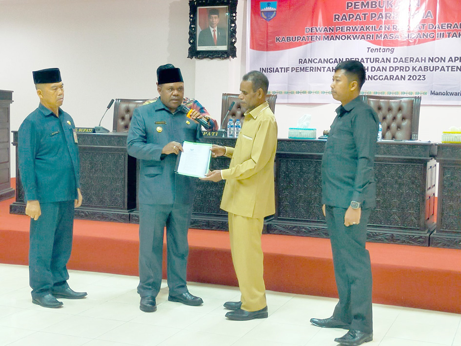 Adapun enam ranperda yang diajukan untuk dibahas pada masa sidang III tahun 2023 ini, yaitu Ranperda tentang Pajak Daerah dan Retribusi Daerah, Ranperda tentang Pengembangan Kebudayaan, Pariwisata, dan Ekonomi Kreatif, serta dan Ranperda tentang Perubahan Ketiga atas Perda Nomor 8 Tahun 2006 tentang Pembentukan dan Susunan Perangkat Daerah Kabupaten Manokwari