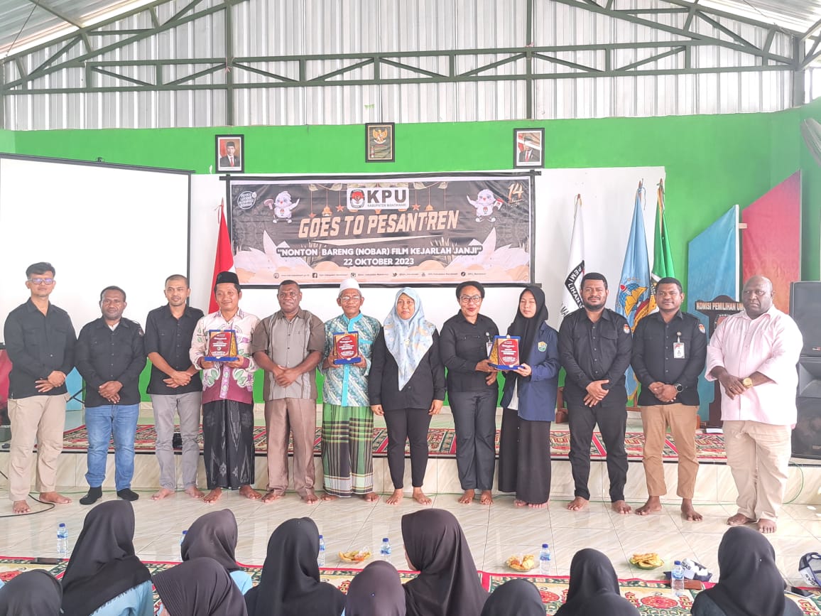 Manokwari, TP – Memperingati Hari Santri Nasional (HSN) yang jatuh pada 22 Oktober 2023, KPU Provinsi Papua Barat dan KPU Kabupaten Manokwari mengajak para santriwan dan santriwati nonton bareng (nobar) film berjudul “Kejarlah Janji” di Pondok Pesantren Darussalam, SP IV Prafi Manokwari, Minggu (22/10).