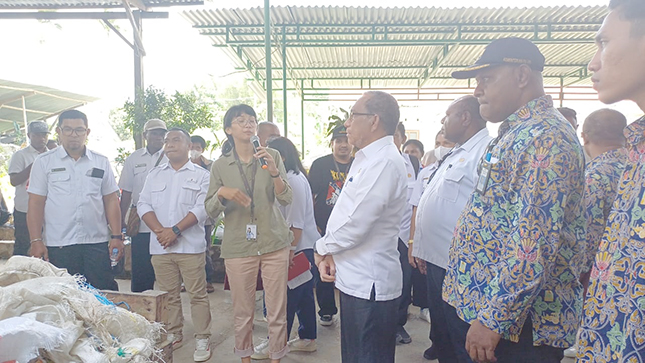 Usai sosialisasi, Asisten bidang administrasi dan umum Kota Sorong didampingi Kasie Wilayah I, Jamaludin Ugar, Kadis Perumahan dan Kawasan Permukiman Kota Sorong, mitra BUMN dan BUMD beserta unit pengumpul sampah meninjau bank sampah yang saat itu tengah beroperasi, mulai dari pemilahan pengepresen dan pencacahan. [RYA-R3]