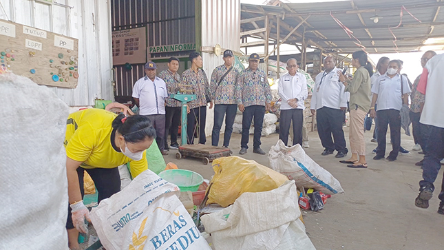 Usai sosialisasi, Asisten bidang administrasi dan umum Kota Sorong didampingi Kasie Wilayah I, Jamaludin Ugar, Kadis Perumahan dan Kawasan Permukiman Kota Sorong, mitra BUMN dan BUMD beserta unit pengumpul sampah meninjau bank sampah yang saat itu tengah beroperasi, mulai dari pemilahan pengepresen dan pencacahan. [RYA-R3]
