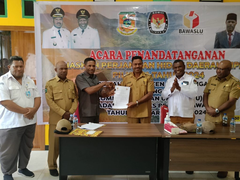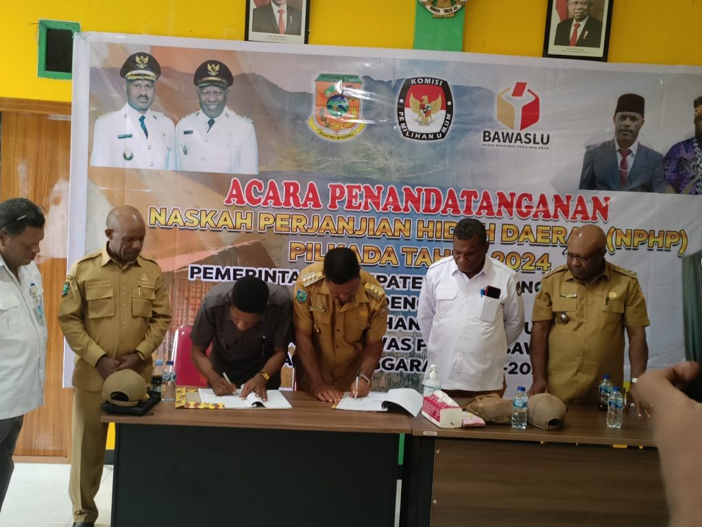 Manokwari, TP – Pemerintah Kabupaten (Pemkab) Pegunungan Arfak (Pegaf) dan KPU Kabupaten Pegaf resmi menandatangani Nas- kah Perjanjian Hibah Daerah (NPHD) Pemili- han Kepala Daerah (Pilkada) Tahun 2024.