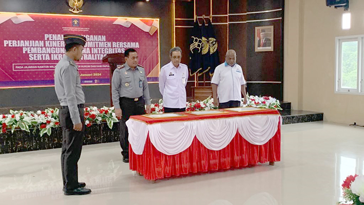 Manokwari, TABURAPOS.CO – Kementerian Hukum dan Hak Asasi Manusia (Kemenkumham) Papua Barat melaksanakan penandatanganan perjanjian kinerja dan komitmen bersama pembangunan zona integritas serta ikrar netralitas Aparat Sipil Negara (ASN).