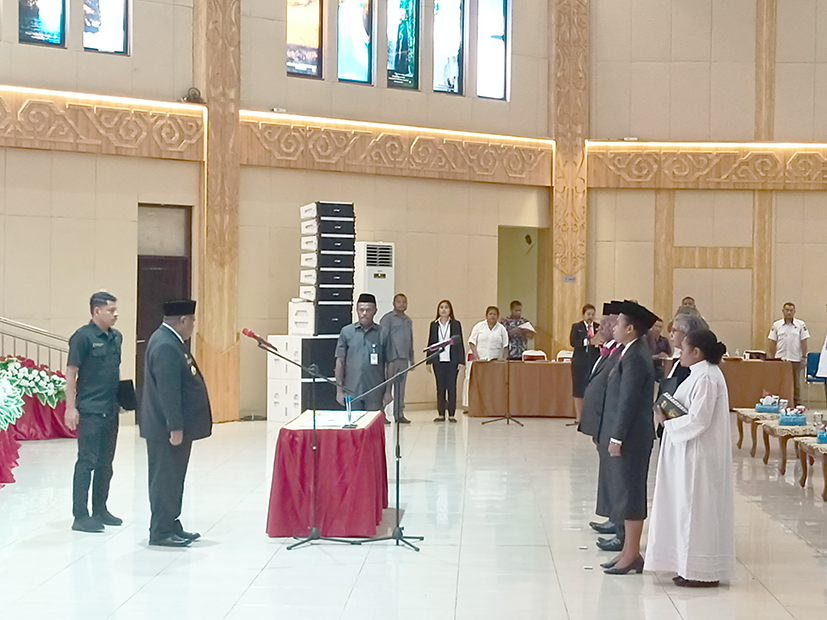 Manokwari, TABURAPOS.CO – Penjabat Gubernur Papua Barat, Ali Baham Temongmere mewakili Mendagri, Tito Karnavian mengambil sumpah dan janji pimpinan Majelis Rakyat Papua Barat (MRPB) periode 2023-2028 di Auditorium PKK Provinsi Papua Barat, Arfai, Manokwari, Rabu (24/1/2024).