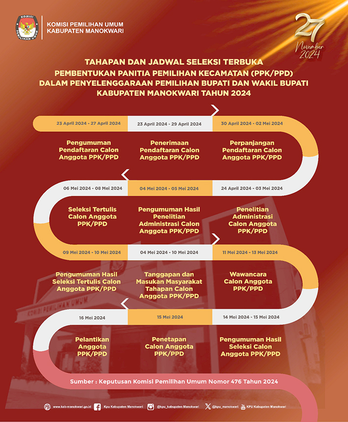 Ketua KPU Kabupaten Manokwari, Christine R. Rumkabu mengatakan, pendaftaran dan penyerahan hasil karya sayembara dimulai 23-26 April 2024 dan pemenangnya akan diumumkan pada 29 April 2024.