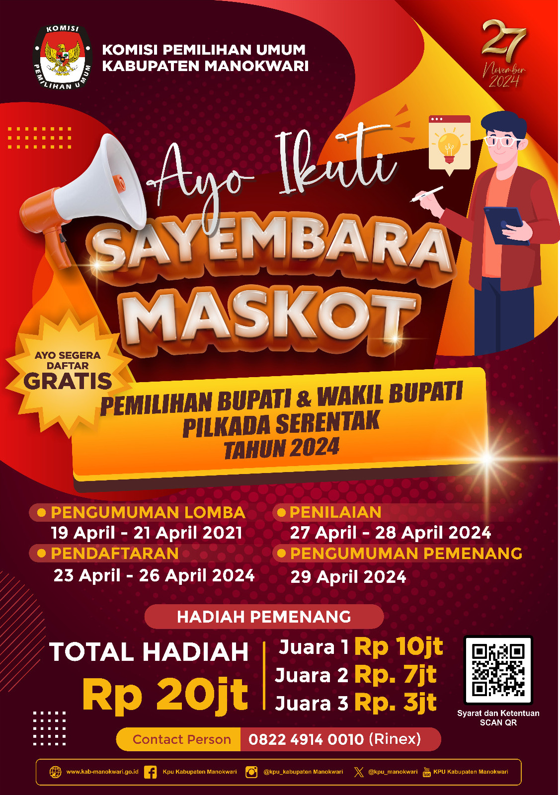 “Hasil karya pemenang sayembara maskot menjadi hak milik KPU Kabupaten Manokwari sepenuhnya dan akan dipakai dalam setiap kegiatan penyelenggaraan Pilkada 2024. Untuk itu, maskot harus dapat memberikan motivasi warga untuk ikut menyukseskan pilkada untuk pemilihan bupati dan wakil bupati Manokwari 2024,” jelas Christine Rumkabu kepada para wartawan di kantornya, Sabtu (20/4/2024).