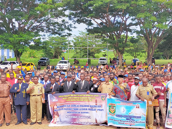 Manokwari, TP – Jemaat dari 23 Gereja Persekutuan Kristen Alkitab Indonesia (GPKAI) Papua Barat yang berada di bawah naungan Majelis Daerah YMNN Leshim Nimbay Prafi, menyerukan agar Pemerintah Kabupaten (Pemkab) Manokwari menegakkan aturan Manokwari sebagai Daerah Injil.