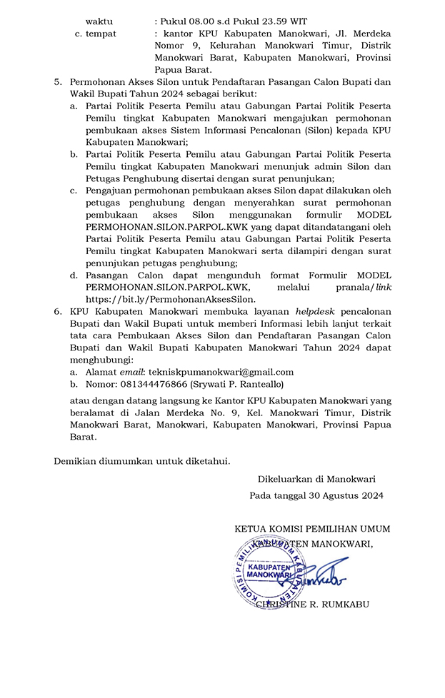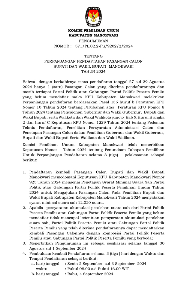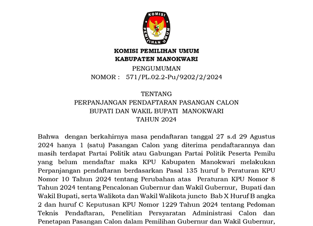 Pengumuman Perpanjangan Pendaftaran Paslon Bupati dan Wakil Bupati Manokwari Tahun 2024