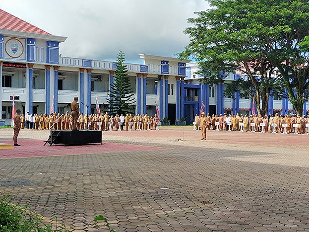 Bupati Manokwari, Hermus Indou saat memimpin apel gabungan di halaman Kantor Bupat, Sowi Gunung, Senin (9/9/2024). TP/SDR