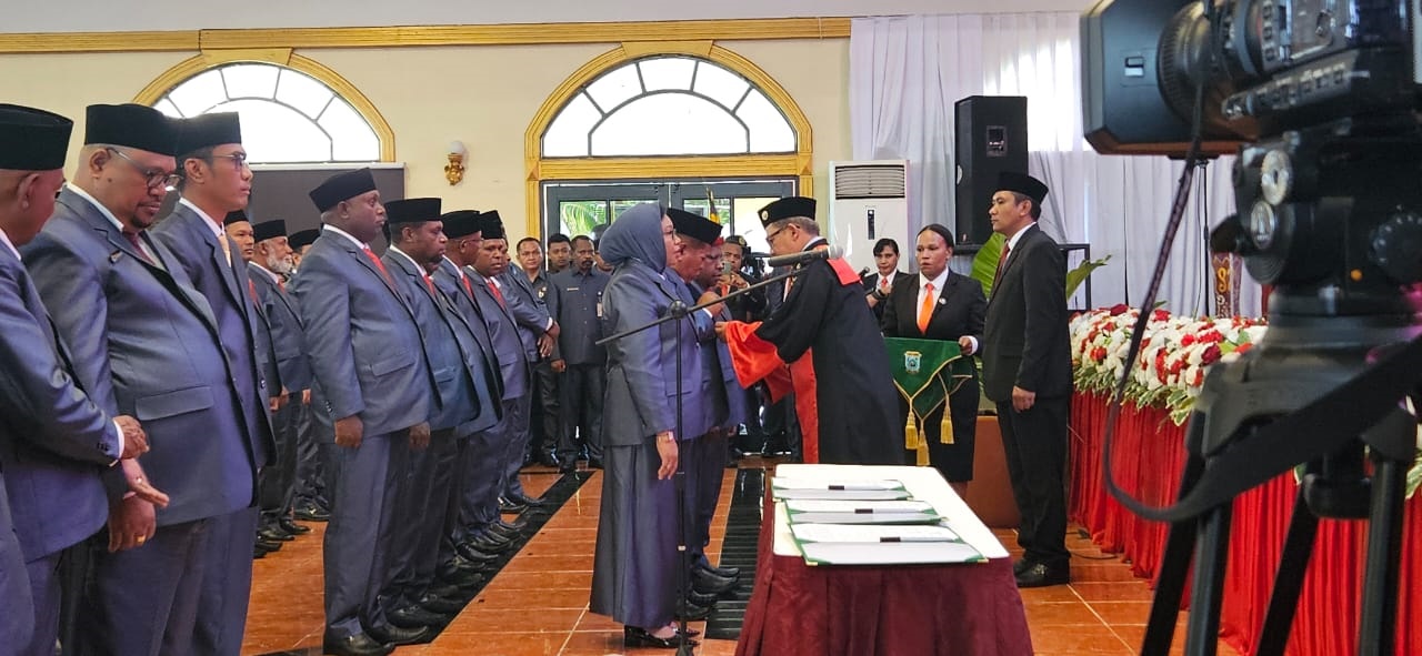 Manokwari, TP – Ketua Pengadilan Tinggi (PT) Papua Barat, Dr. Budi Santoso, SH, MH mengambil sumpah dan janji 35 anggota DPR Papua Barat periode 2024-2029 di Aston Niu Hotel, Manokwari, Rabu (2/10/2024).