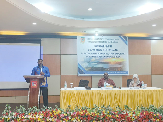 Manokwari, TP – Dinas Pendidikan, Pemuda, dan Olahraga Kabupaten Pegunungan Arfak mengadakan sosialisasi Platform Merdeka Mengajar (PMM) dan e-Kinerja terhadap satuan pendidikan SD, SMP, SMA, dan SMK se-Kabupaten Pegaf di salah satu hotel di Manokwari, Jumat, 13 Desember 2024.