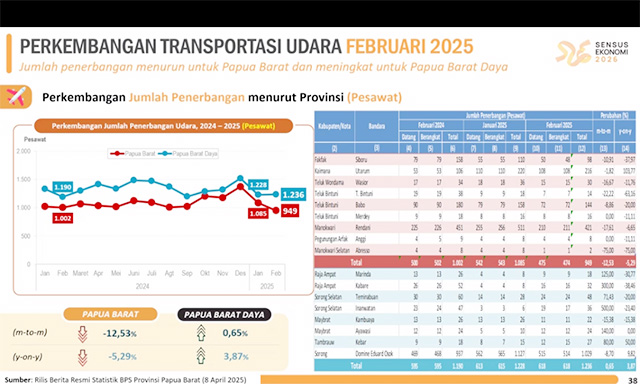 Kepala BPS Papua Barat, Merry menjelaskan, jumlah penerbangan di Papua Barat pada Februari 2025 sebanyak 949 pesawat terjadi penurunan secara bulanan sebesar 12,53 persen dan secara tahunan turun sebesar 5,29 persen.