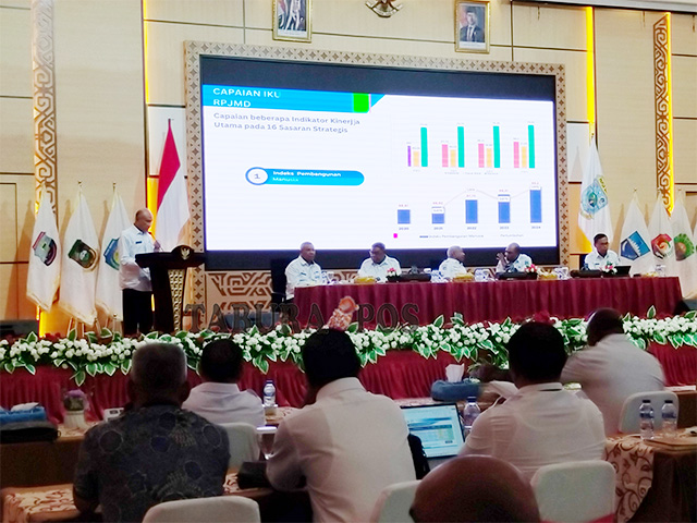 Bupati Kaimana, Hasan Achmad memaparkan visi misi pembangunan, pada raker bupati se-Papua Barat, di Auditorium PKK Arfai, Rabu (23/4/2025). TP/SDR