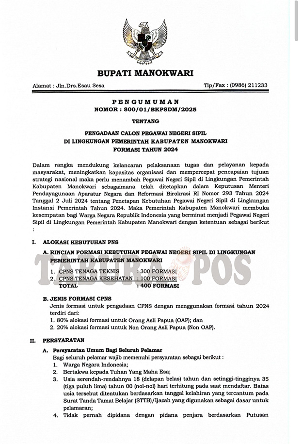 Pengumuman dengan Nomor: 800/01/BKPSDM/2025 dan ditandatangani Bupati Manokwari, Hermus Indou sudah beredar luas dan pencari kerja yang ingin mendaftar bisa melihat pengumuman tersebut. “Bisa cek di pengumuman,” jawabnya.