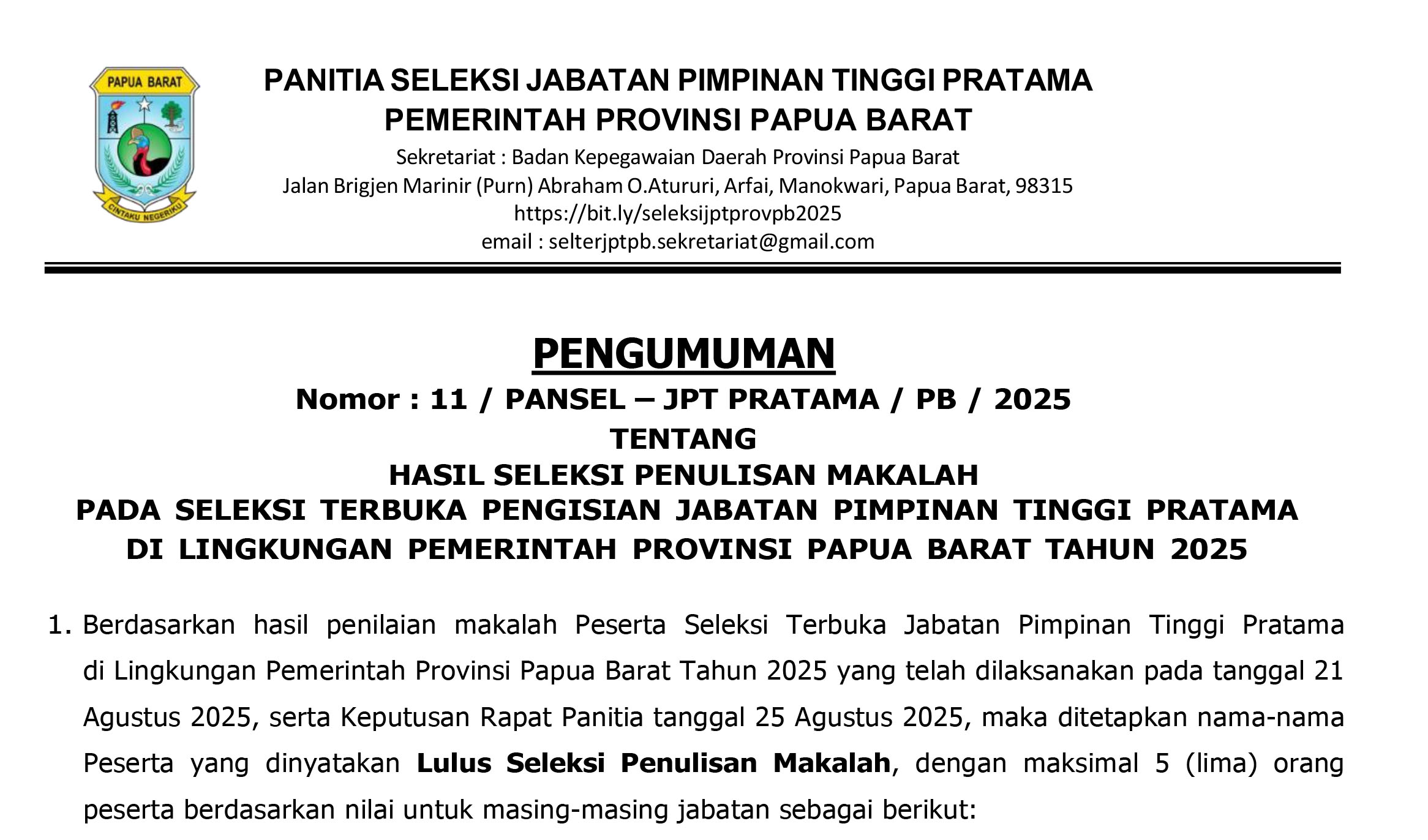 Peserta yang dinyatakan lulus ditetapkan dalam Surat Pengumuman Pansel Nomor: 11/PANSEL-JPT PRATAMA/PB/2025 tentang Hasil Seleksi Penulisan Makalah pada Selter Pengisian JPT Pratama di lingkungan Pemprov papua Barat Tahun 2025, tertanggal 25 Agustus 2025.