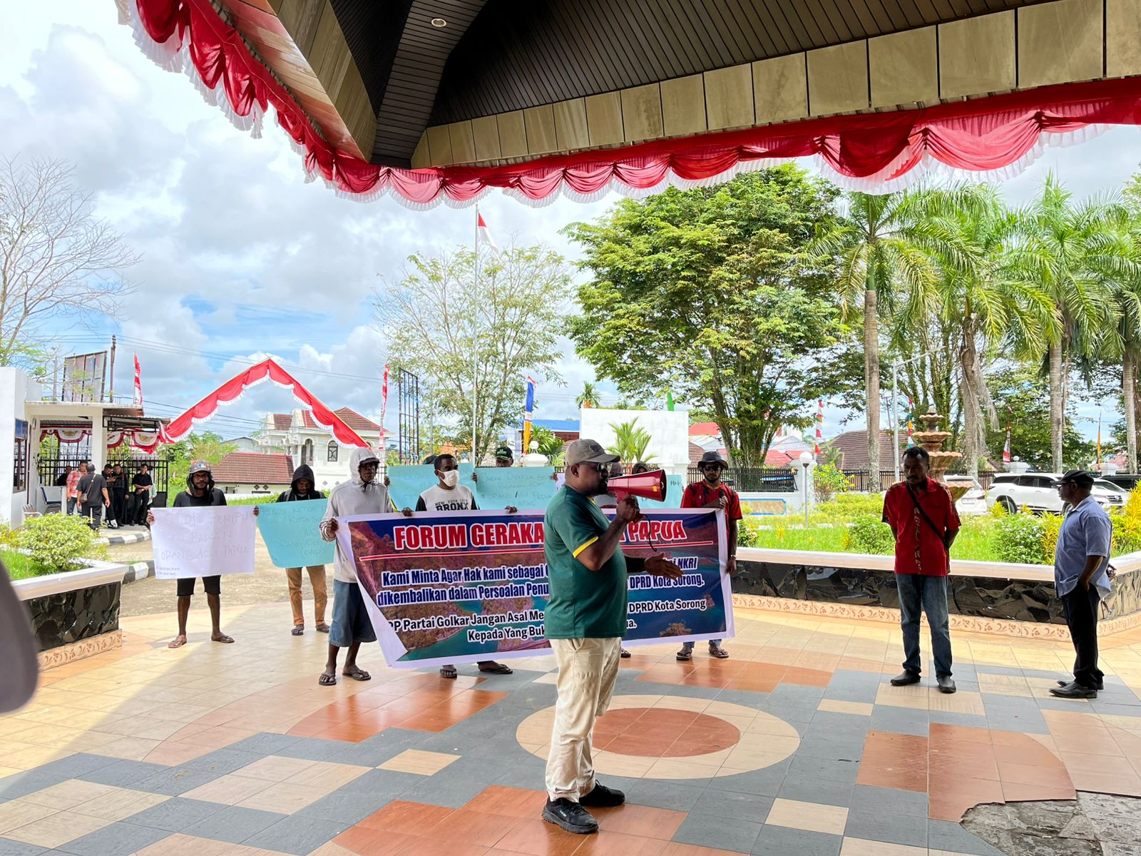 Dalam orasinya, massa aksi menuntut hak-hak Orang Asli Papua (OAP) dalam penunjukan Ketua DPRD Kota Sorong.