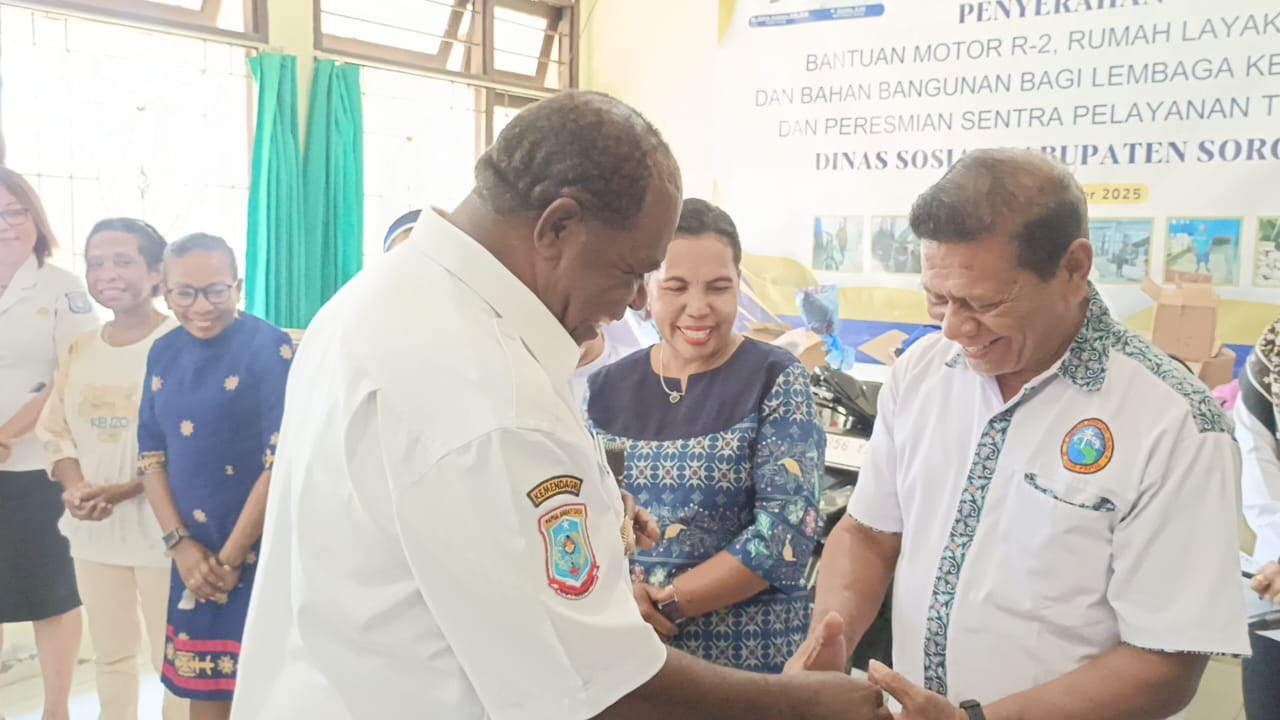 Sorong,TP-Pemerintah Kabupaten Sorong melalui Dinas Sosial menyerahkan bantuan kendaraan roda dua, rumah layak huni, serta bahan bangunan bagi lembaga keagamaan. Pada kesempatan yang sama, turut diresmikan Sentra Pelayanan Terpadu. Acara ini berlangsung di Kantor Dinas Sosial Kabupaten Sorong, Papua Barat Daya, Rabu,(03/09/25)