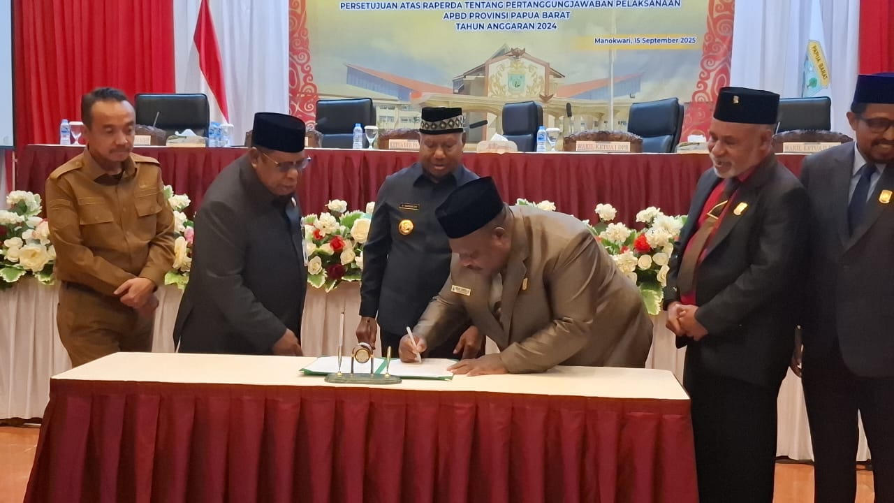 Sebelum disahkan, Lima Fraksi DPR Papua Barat menyampaikan pandangan akhir Fraksi pada Rapat Paripurna DPR Papua Barat di Aston Niu Hotel Manokwari, Senin (15/9/2025) malam. Dalam pandangan akhir Fraksi-fraksi DPR Papua Barat memberikan sejumlah catatan konstruktif terhadap realisasi APBD Papua Barat Tahun 2024 guna dapat memperbaiki APBD pada tahun mendatang.