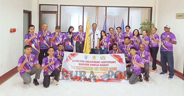 Manokwari, TP – Rektor Universitas Papua (UNIPA), Dr. Hugo Warami, melepas kontingen Badan Pembina Olahraga Mahasiswa Indonesia (BAPOMI) Papua Barat, berkompetisi dalam Pekan Olahraga Mahasiswa Nasional (POMNAS) XIX di Jawa Tengah tahun 2025. Pelepasan di Ruang Rapat Lantai 4 Gedung Rektorat UNIPA, Manokwari, pada Rabu (17/09).