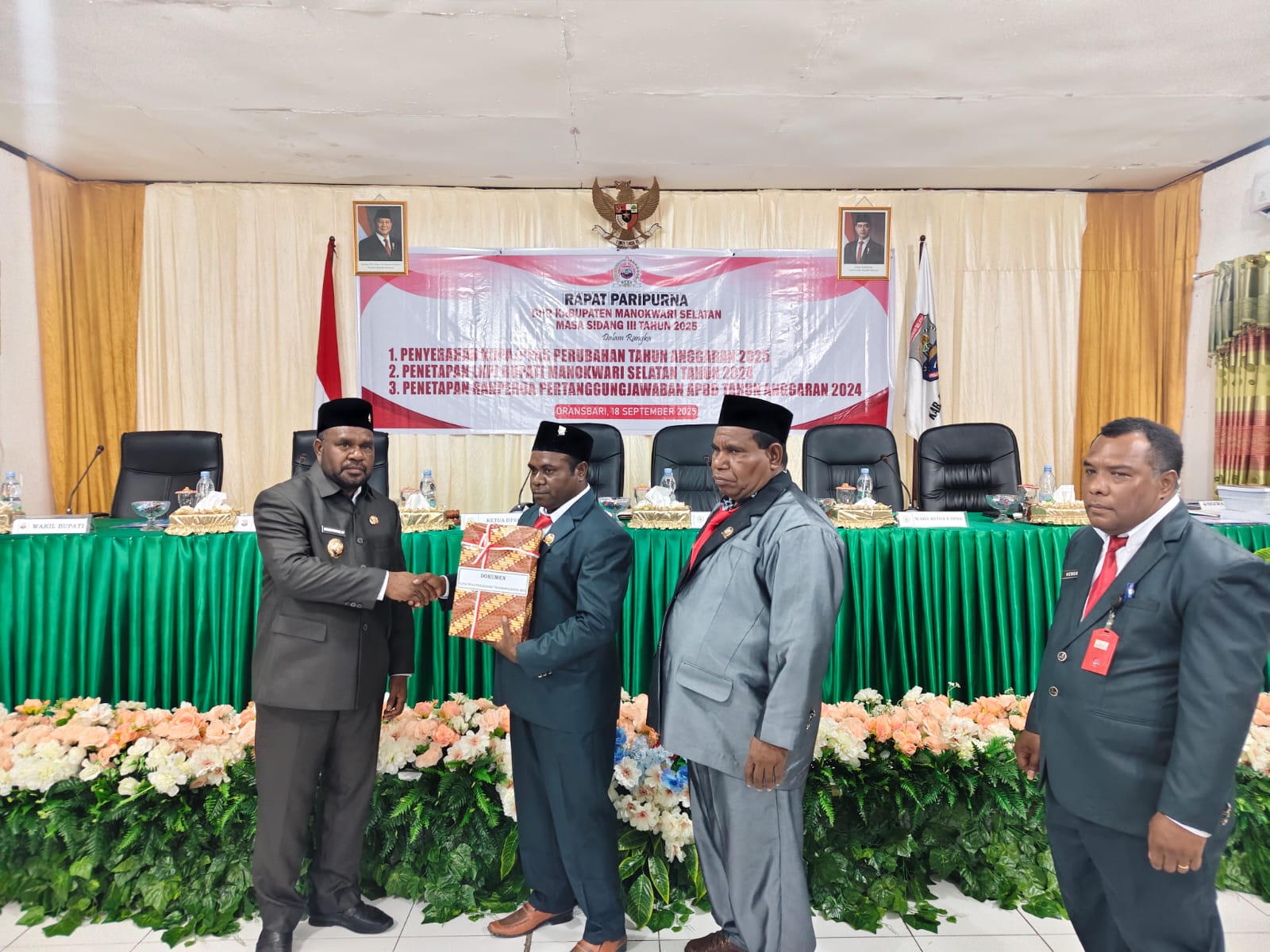 Oransbari, TP – Dewan Perwakilan Rakyat Kabupaten Manokwari Selatan (DPRK Mansel) menggelar Rapat Paripurna Masa Sidang III Tahun 2025 dalam rangka penyerahan KUA/PPAS Perubahan APBD Tahun Anggaran 2025, penetapan LKPJ Bupati Mansel Tahun 2024, dan penetapan ranperda pertanggungjawaban APBD Tahun Anggaran 2024.