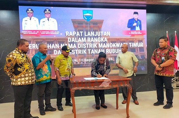 Manokwari, TP – Rapat lanjutan pembahasan perubahan nama Distrik Manokwari Timur (Mantim) dan Distrik Tanah Rubuh, yang dilaksanakan Bagian Tata Pemerintah dan Otonomi Daerah (PemOtda) Kabupaten Manokwari, di Sasana Karya Kantor Bupati Manokwari, Kamis (18/9/2025), menghasilkan dua nama.