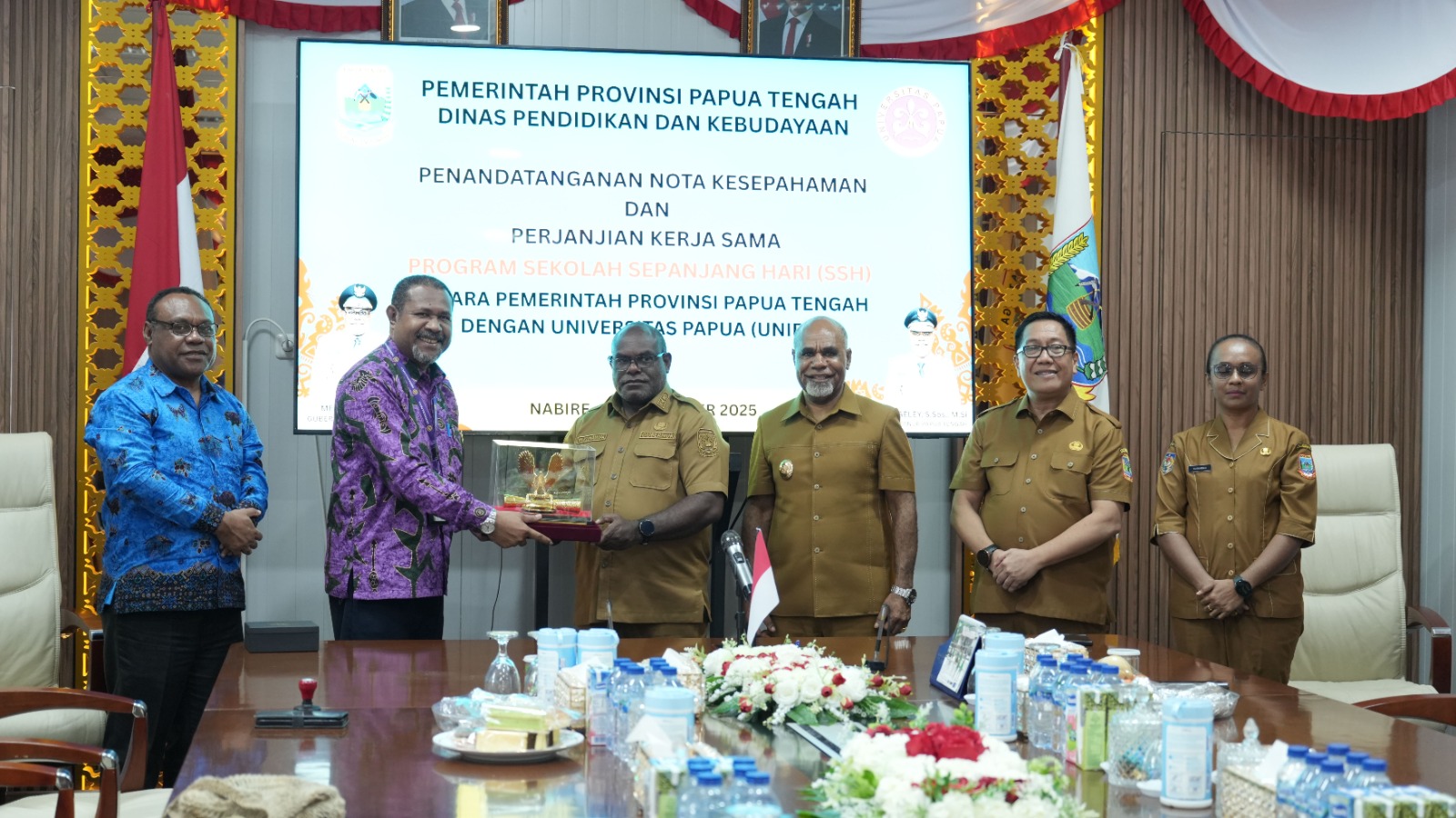 Nabire, TP – Rektor Universitas Papua, Hugo Warami bersama Gubernur Papua Tengah, Meky Nawipa menandatangani Perjanjian Kerjasama (PKS) tentang Pelaksanaan Program Sekolah Sepanjang Hari (SSH) di Nabire, Provinsi Papua Tengah, Selasa (23/9/2025).