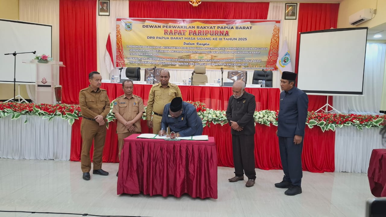 Manokwari, TP – Dewan Perwakilan Rakyat Papua Barat (DPR -PB) bersama Pemerintah Provinsi (Pemprov) Papua Barat menyepakati Nota Keuangan Kebijakan Umum Anggaran dan Prioritas Plafon Anggaran Sementara (KUA-PPAS) APBD Perubahan Tahun Anggaran 2025.