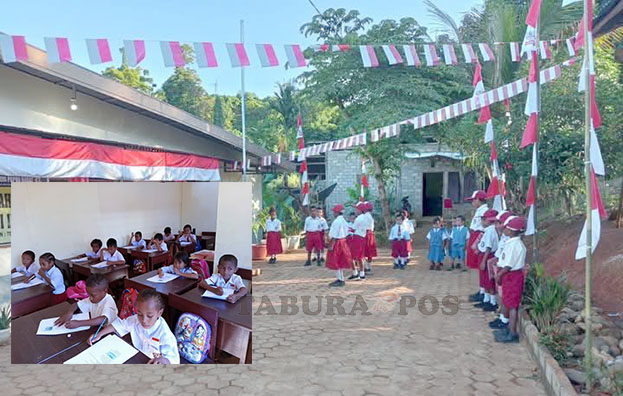 Tampak sejumlah siswa SD Sowi Indah Yayasan Cahaya Papua Barat sedang mengikuti proses belajar mengajar, Senin (06/10). Foto : TP/ AND