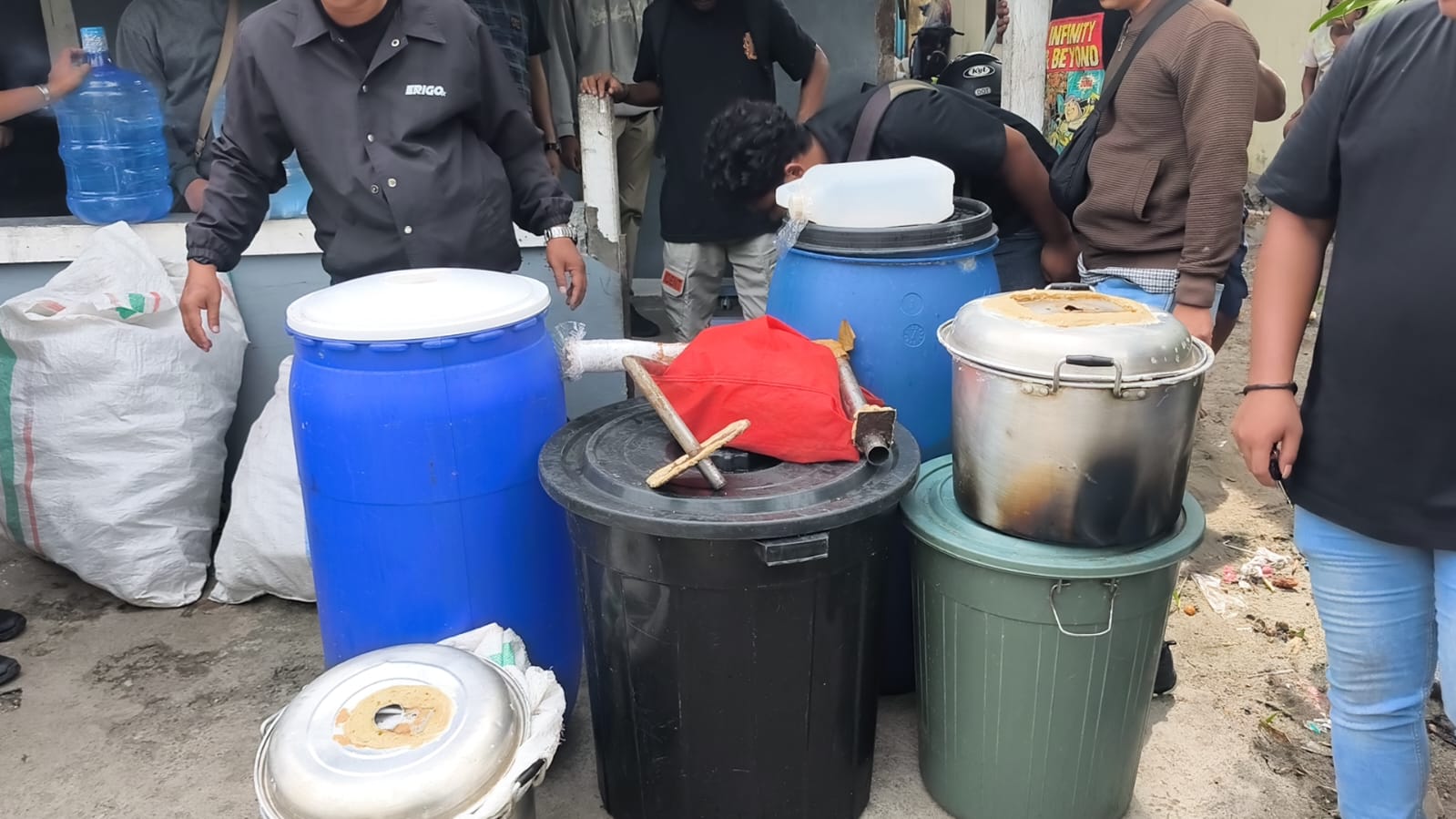 Barang bukti yang berhasil diamankan berupa 3 buah panci, 3 buah ember hitam ukuran 80 liter berisi CT, 1 ember hijau ukuran 60 liter berisi CT, 3 buah galon berisi CT, 5 buah aqua besar berisi CT, 3 buah kompor minyak, 2 buah drom plastik, 3 buah pipa besi penyulingan, 1 buah ember kecil berisi bahan baku, 1 buah ember sedang berisi air, 1 buah ember hitam besar, 1 buah ember hijau sedang, 2 buah dandang, 6 buah jerigen 5 liter, 2 buah karung besar berisi botol kosong, 2 buah selang besi, 1 kantong merah berisi bungkus permipan dan pembungkus gula, 2 buah ceret, 1 gulungan sumbu kompor, 2 buah bungkus sumbu kompor, 1 buah corong.