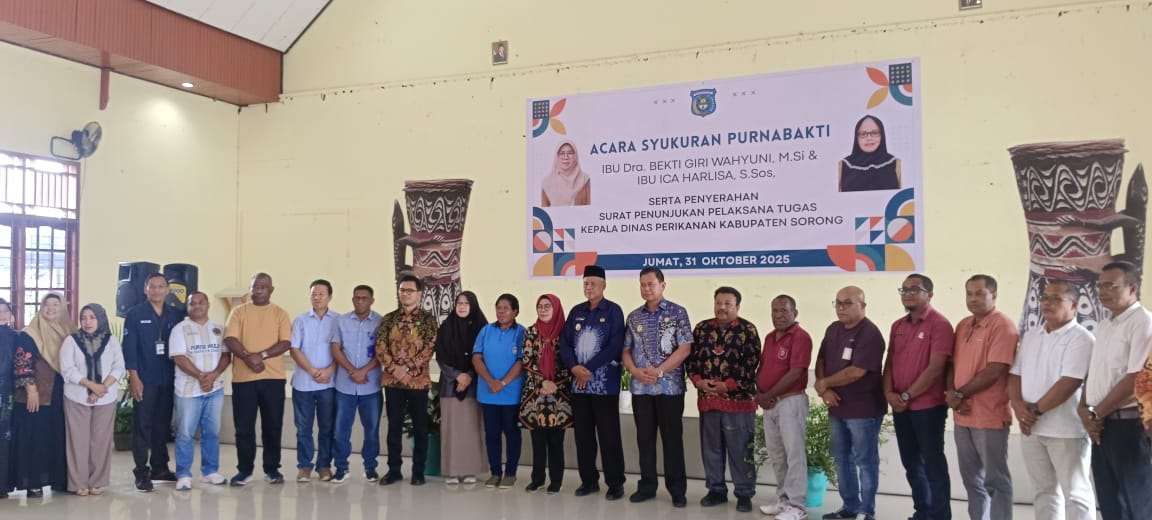 Aimas, TP – Suasana haru menyelimuti acara syukuran purna bakti Kepala Dinas Perikanan Kabupaten Sorong, Dra. Bekti Giri Wahyuni, M.Si, sekaligus penyerahan surat penunjukan pelaksana tugas (Plt) Kepala Dinas Perikanan yang baru, Jumat (31/10/2025).