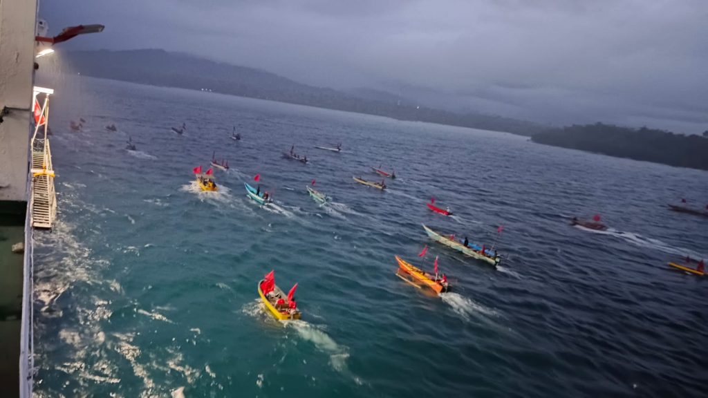 Nabire, TP – Ratusan Perahu Ketinting (longboat)dihiasi bendera Partai PDI Perjuangan menyambut kedatangan peserta Konfrensi Daerah (Konferda) Provinsi Papua Barat dan Papua Barat Daya yang tiba menggunakan KM Dorolonda di Pelabuhan Samabusa, Nabire, Papua Tengah, Rabu (5/11) pagi.