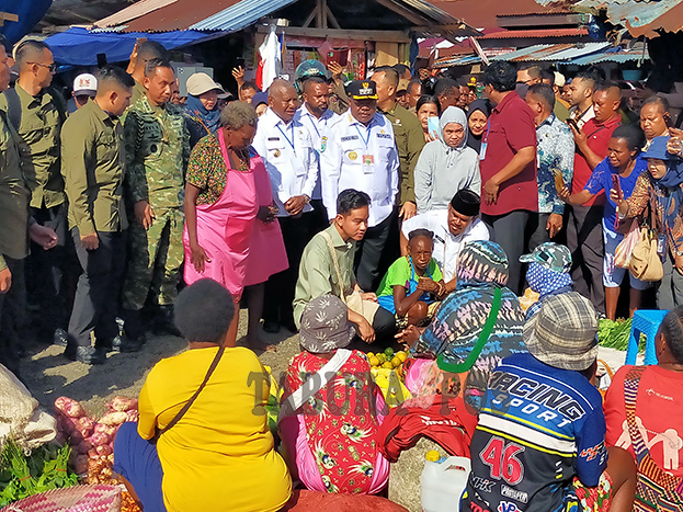 “Ini mama yang tanam sendiri,” tanya Gibran sembari menunjuk jagung dan jeruk milik seorang mama Papua yang terhampar di tanah beralaskan karung.