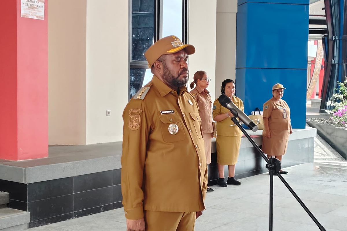 Bupati Manokwari Selatan, Bernard Mandacan saat memimpin apel gabungan OPD lingkungan Pemkab Mansel di parkiran Kantor Bupati Mansel, Bukit Boako Ransiki, Senin (10/11). Foto:TP/BOM