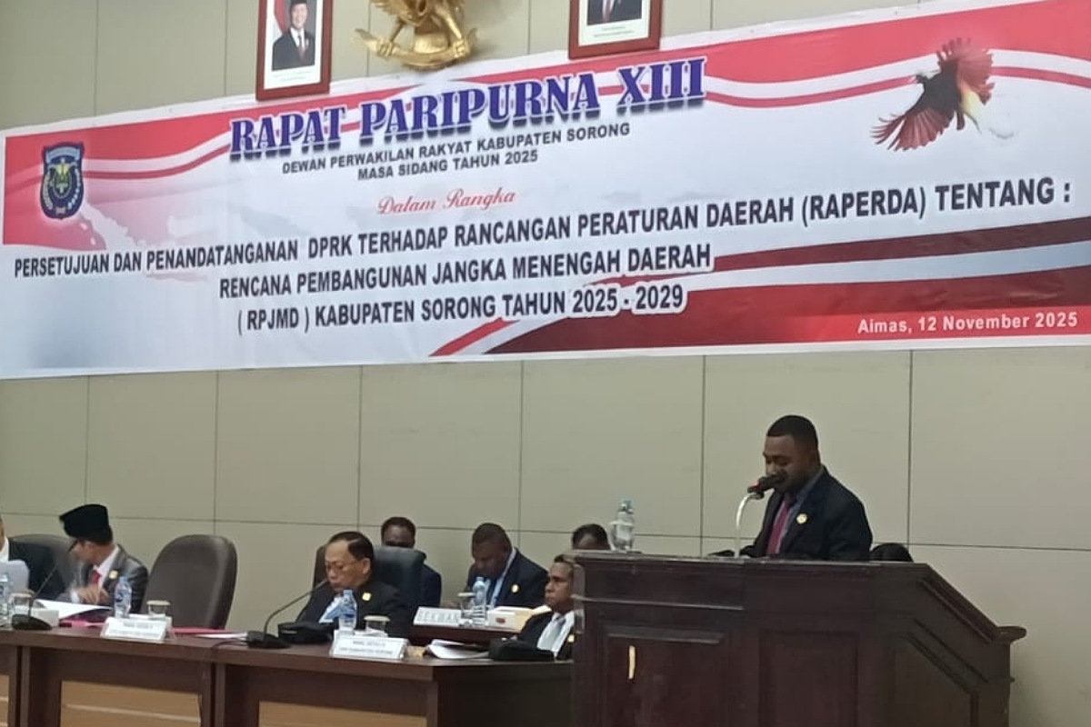 Hal ini disampaikan Anggota DPR Kabupaten Sorong, Viktor Urini saat menyampaikan pendapat akhir Fraksi Otsus terhadap Rancangan Peraturan Daerah (Raperda) tentang Rencana Pembangunan Jangka Menengah Daerah (RPJMD) Tahun 2025–2029 dalam Rapat Paripurna XIII DPR Kabupaten Sorong, Rabu (12/11/2025).