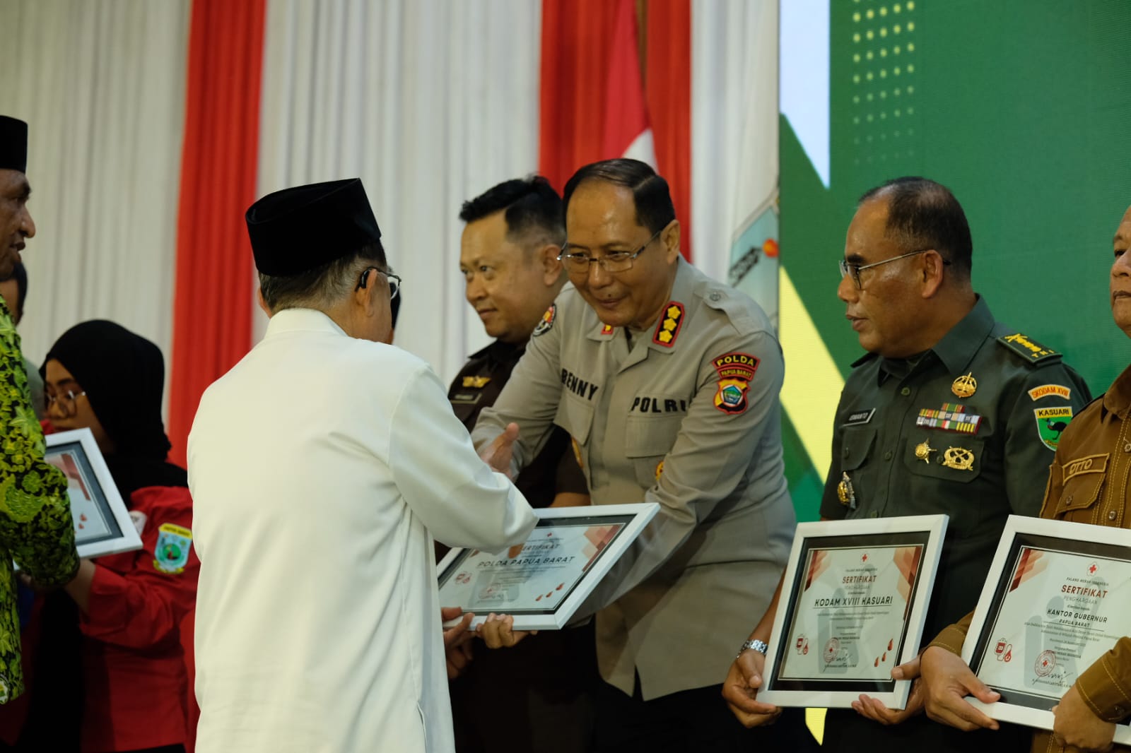 Manokwari, TP – Kabid Humas Polda Papua Barat Kombes Pol Ignatius Benny Ady Prabowo, S.H., S.I.K., M.Kom menghadiri Pelantikan Dewan Pengurus Wilayah Palang Merah Indonesia (PMI) dan Dewan Masjid Indonesia (DMI) Provinsi Papua Barat yang dipimpin langsung oleh Ketua Umum DMI dan PMI, Dr. (H.C.) Drs. H. Muhammad Jusuf Kalla, bertempat di Aston Niu Hotel Manokwari, Senin (24/11).