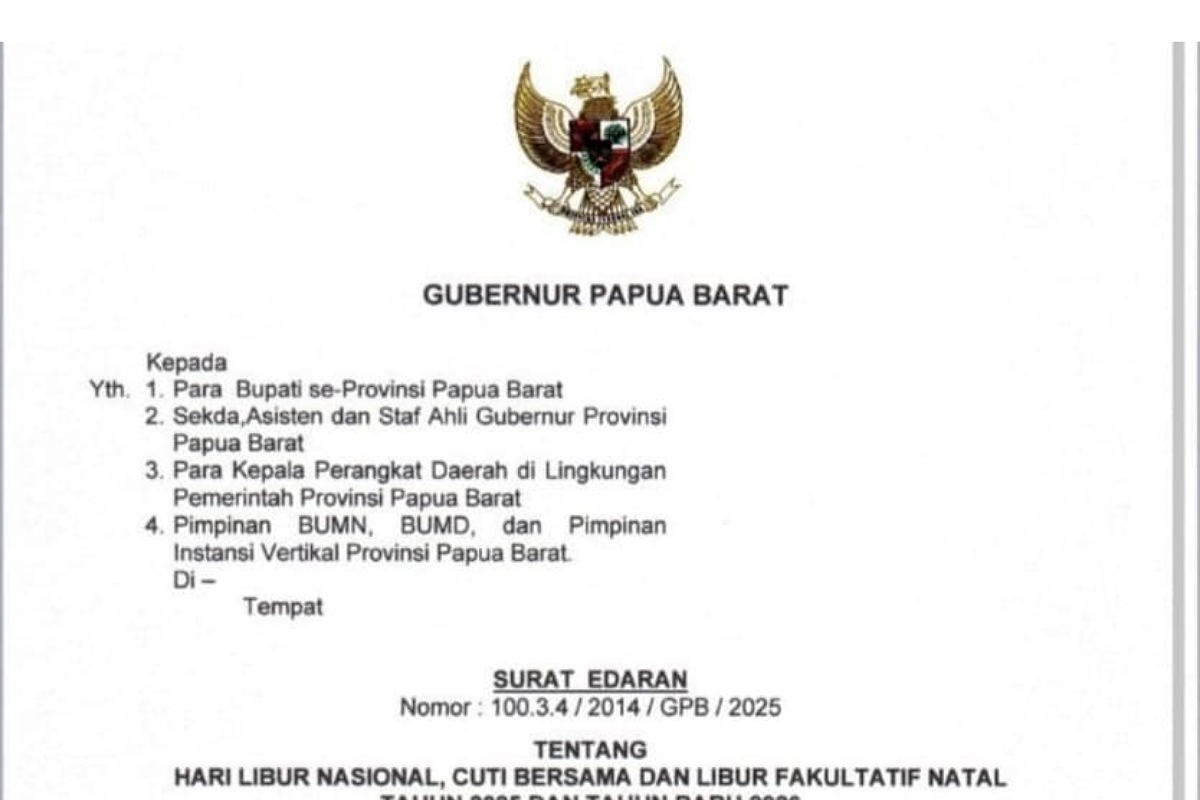 Manokwari, TP – Gubernur Papua Barat, Dominggus Mandacan menerbitkan surat edaran Nomor: 100.3,4/2013/GPB/XII/2025 tentang Kesiapsiagaan Pemerintah Daerah pada Libur Natal Tahun 2025 dan Tahun Baru 2026 tertanggal 8 Desember 2025.