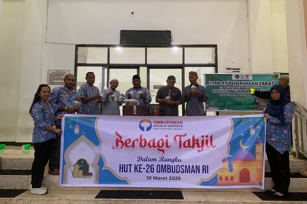 Manokwari, TP – Bulan suci Ramadhan tahun ini juga bertepatan dengan Hari Ulang Tahun (HUT) ke-26 Ombudsman Papua Barat, seluruh insan lembaga tersebut menggelar acara berbagi Tahjil bersama di Masjid Jamil Merdeka Borasi, Manokwari, Selasa (10/3).