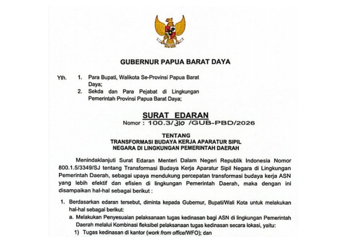 Sorong, TP – Pemerintah Provinsi Papua Barat Daya resmi menerapkan kebijakan Work From Home (WFH) atau bekerja dari rumah bagi Aparatur Sipil Negara (ASN) setiap hari Jumat. Kebijakan ini tertuang dalam Surat Edaran Nomor 100-3/310/GUB-PBD/2026 tentang transformasi budaya kerja.