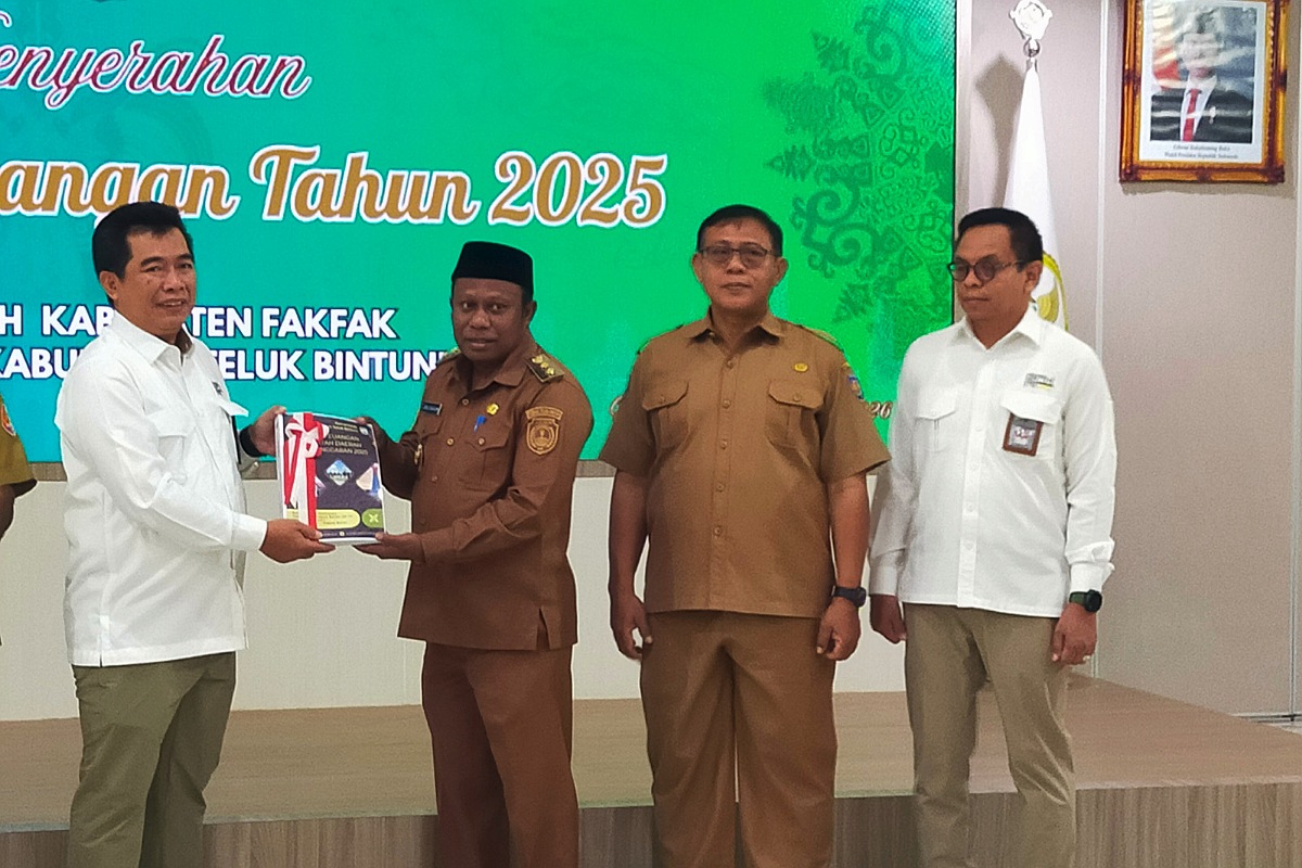 Wakil Bupati Teluk Bintuni, Joko Lingara menyerahkan dokumen LKPD 2025 ke BPK Perwakilan Papua Barat, Selasa (28/4/2026). TP/SDR