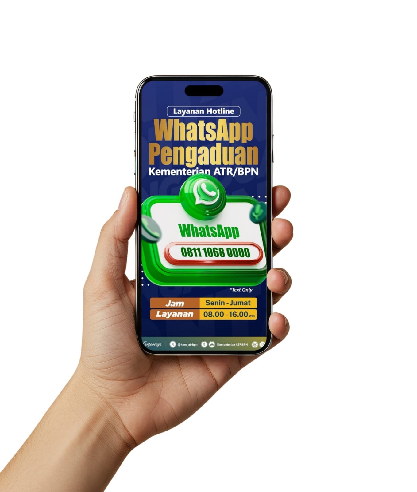 Saat ini, ada empat kanal resmi pengaduan yang disediakan Kementerian ATR/BPN, yaitu _Hotline_ WhatsApp Pengaduan dengan nomor 0811-1068-0000; _email_ resmi pengaduan melalui surat@atrbpn.go.id; loket persuratan untuk pengaduan tertulis dengan dokumen pendukung; dan SP4N-LAPOR! sebagai platform nasional pengelolaan pengaduan masyarakat.
